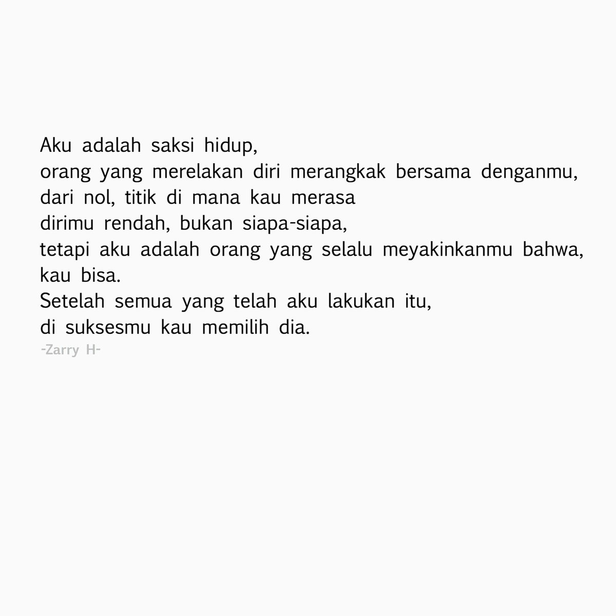 Tak jarang Zarry Hendrik menuliskan kalimat-kalimat patah hati di akun Twitternya Zarryhendrik dan membuat para followersnya yang tengah galau makin galau ataupun yang nggak sedang galau jadi. Tapi kurasa abjad yang kau susun di layar berhasil menembus hati yang menggigil karena rindu. Kamu lupa yang terpenting yaitu memperbaiki diri.