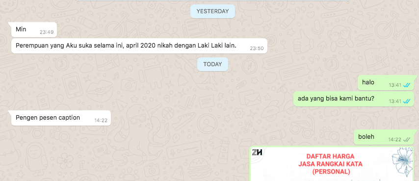 Bedanya jasa merangkai kata Kapitulis ini cakupannya luas bisa untuk personal dan bisnis. Kapanlagi Plus - Mengungkapkan perasaan dapat dilakukan dengan cara sederhana lewat sebuah kata-kata yang dikirim buat gebetanKata-kata baper yang bikin jatuh hati bisa menjadi pilihan paling mudah mencuri perhatian sang pujaanBukan hanya bikin baper melainkan kata-kata tersebut memiliki makna yang mendalam dan sangat berkesan. Zarry Hendrik Umbar Kata Cinta di Sekarangku Dini Nurilah.